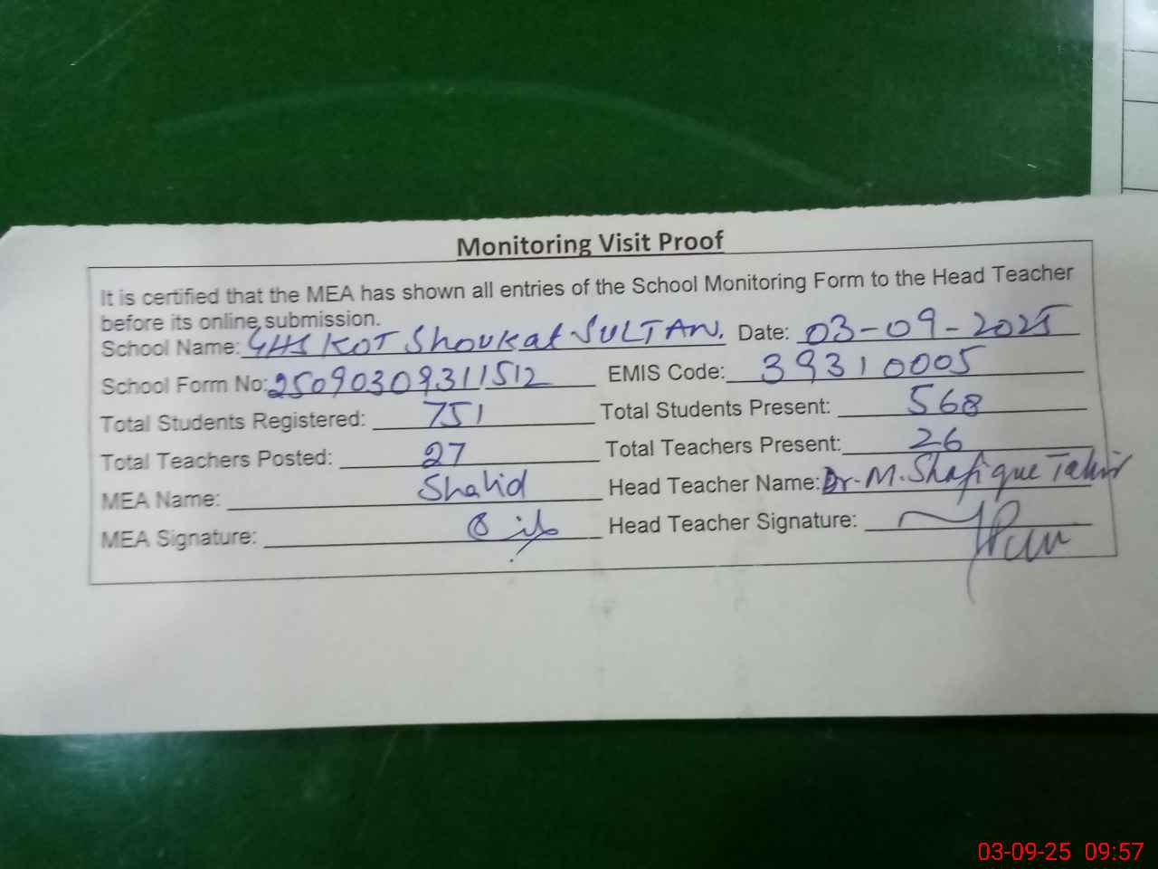 | Monitoring Date: 03-09-2025 | Start Time: 03-09-2025 09:31 AM | End Time: 03-09-2025 09:58 AM | Name of MEA: SH**** YO**** | |