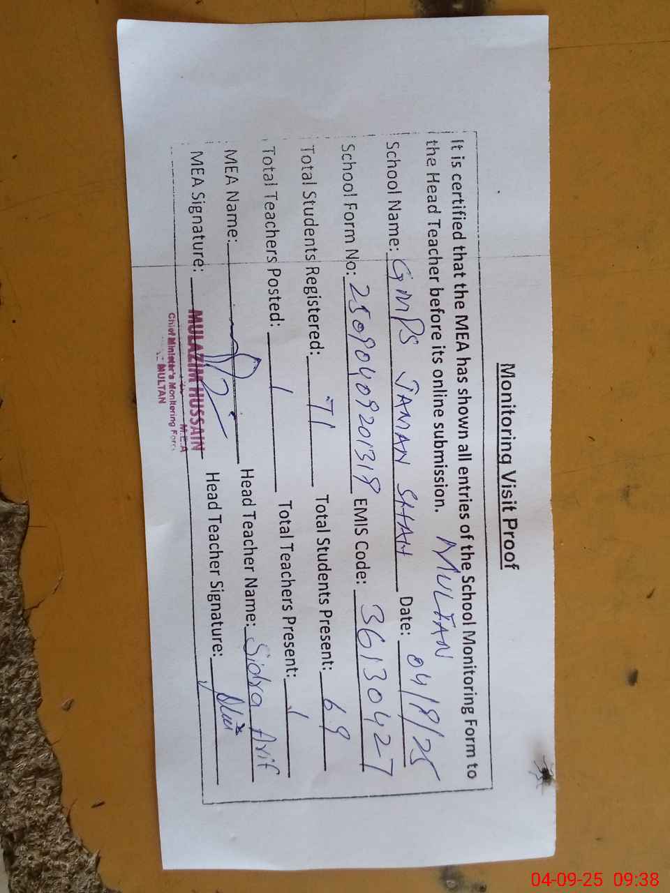 | Attendance Register | Head Teacher | MEA with School | Visit Proof |