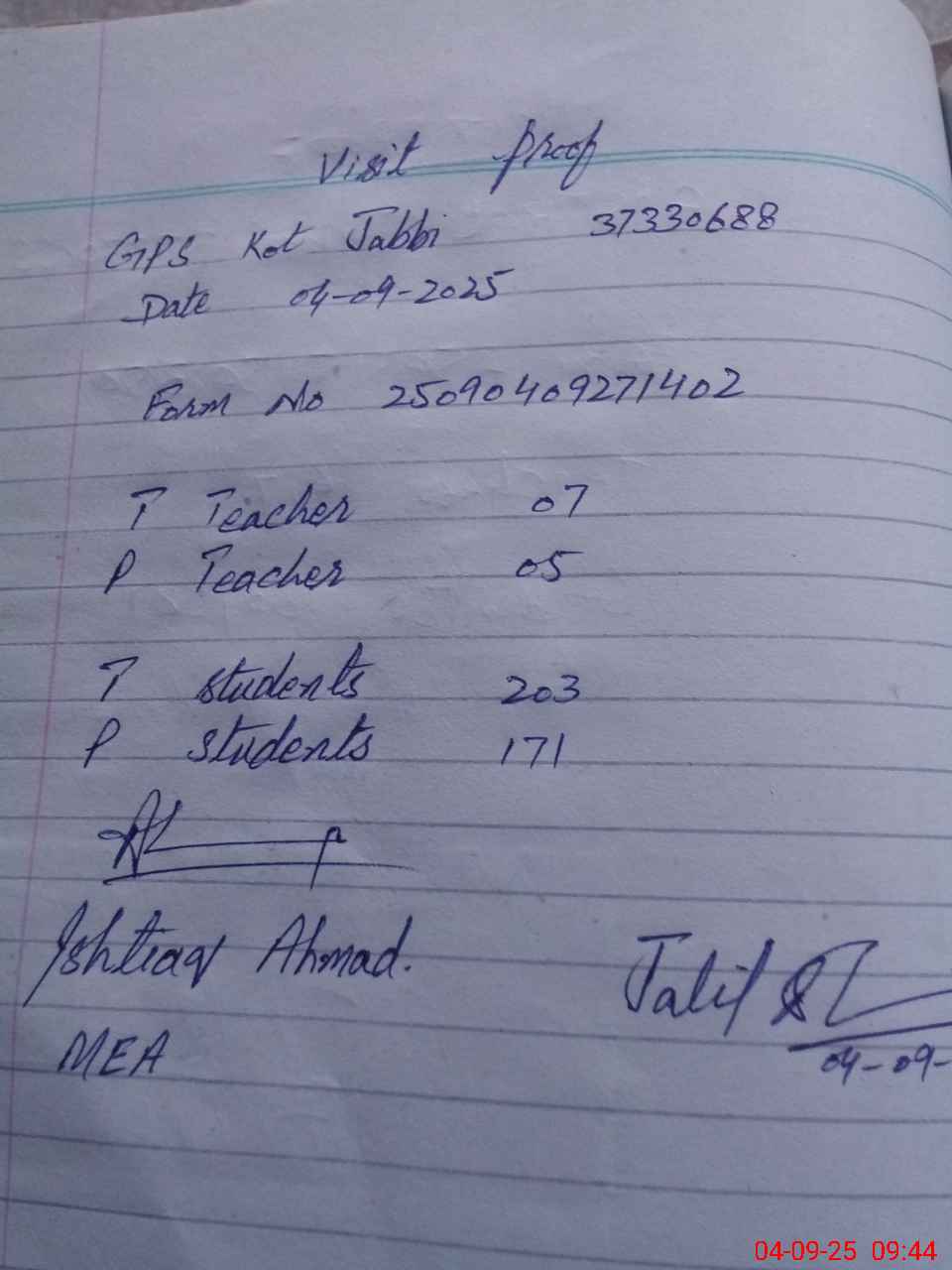 | Attendance Register | Head Teacher | MEA with School | Visit Proof |