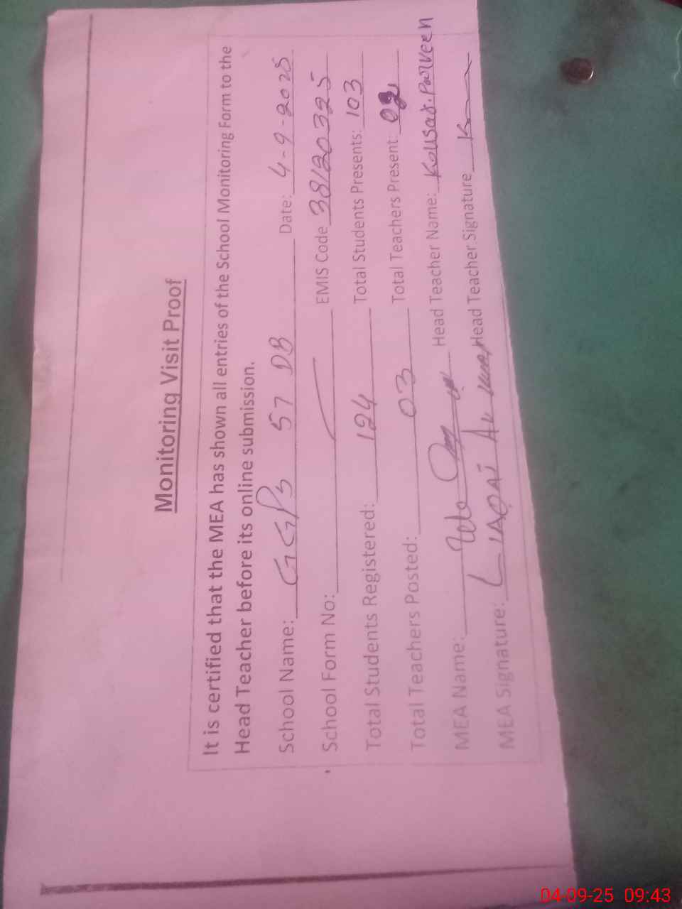 | Attendance Register | Head Teacher | MEA with School | Visit Proof |