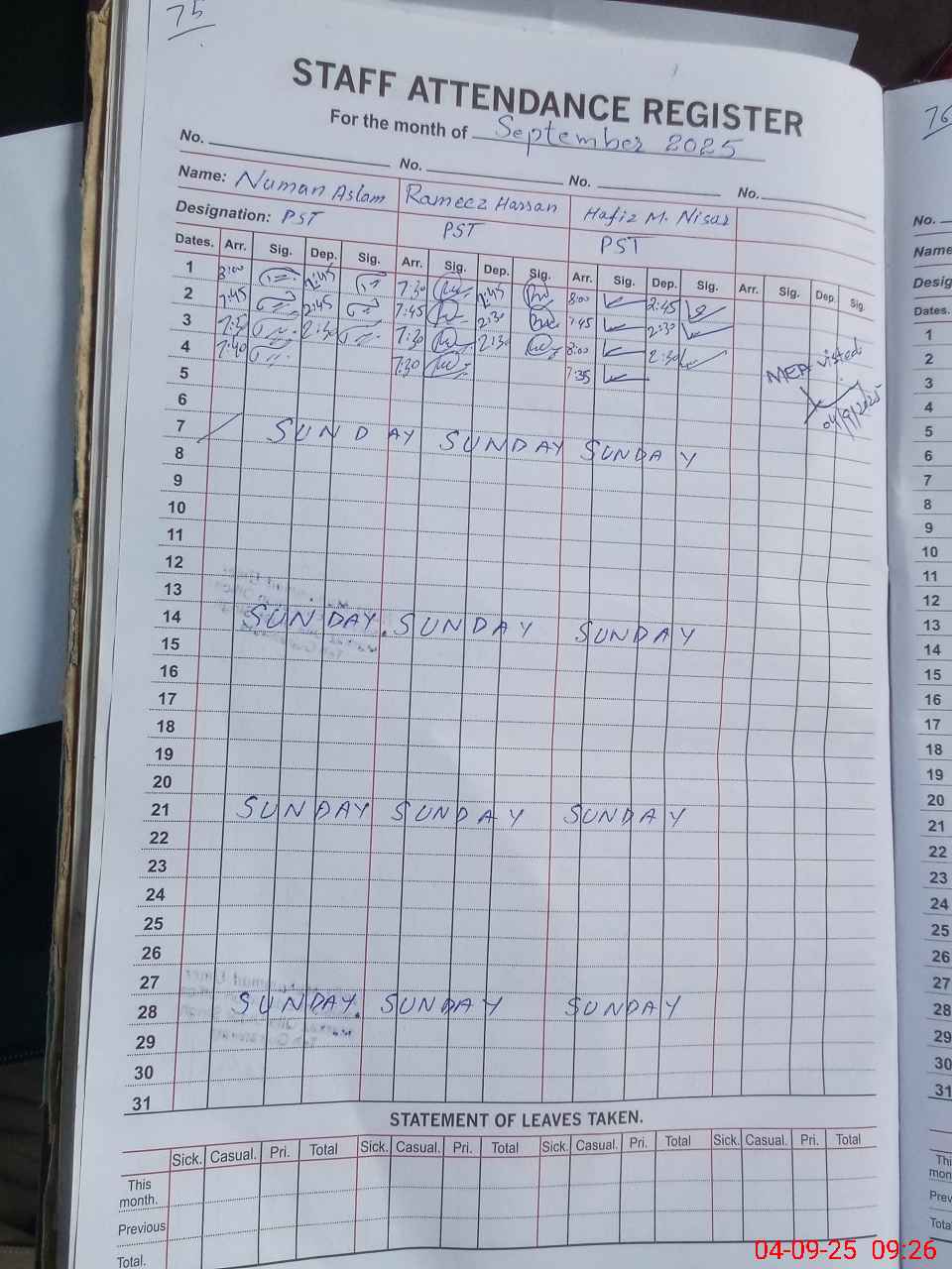 | Leave | Duty | Absent | Maternity | Medical | Ex- Pak |