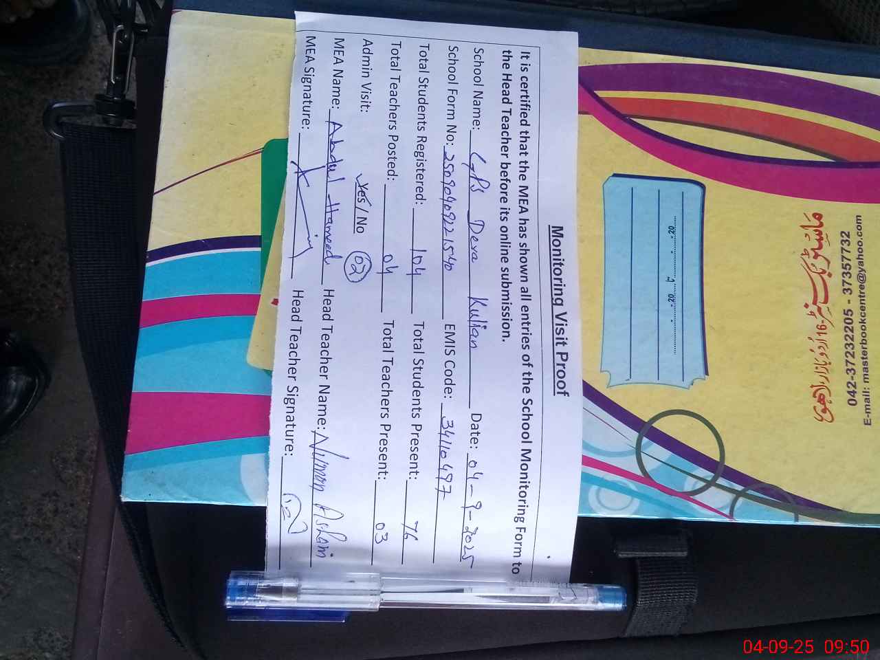 | Attendance Register | Head Teacher | MEA with School | Visit Proof |