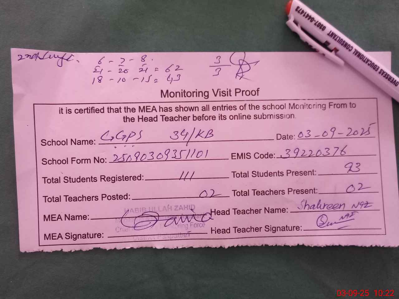 | EMIS Code: 39220376 | Name of School: GGPS 34 KB | |||
