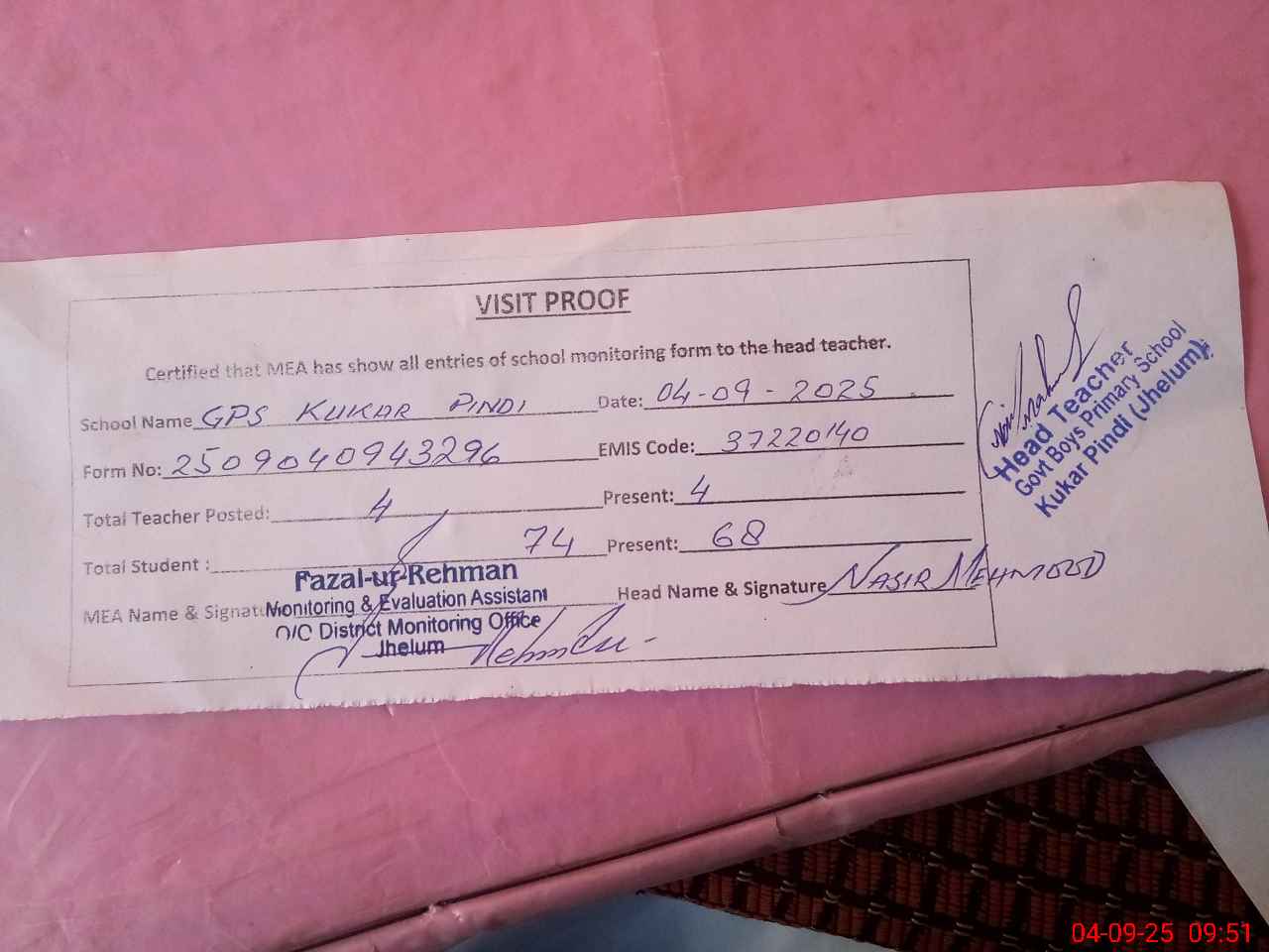 | Attendance Register | Head Teacher | MEA with School | Visit Proof |