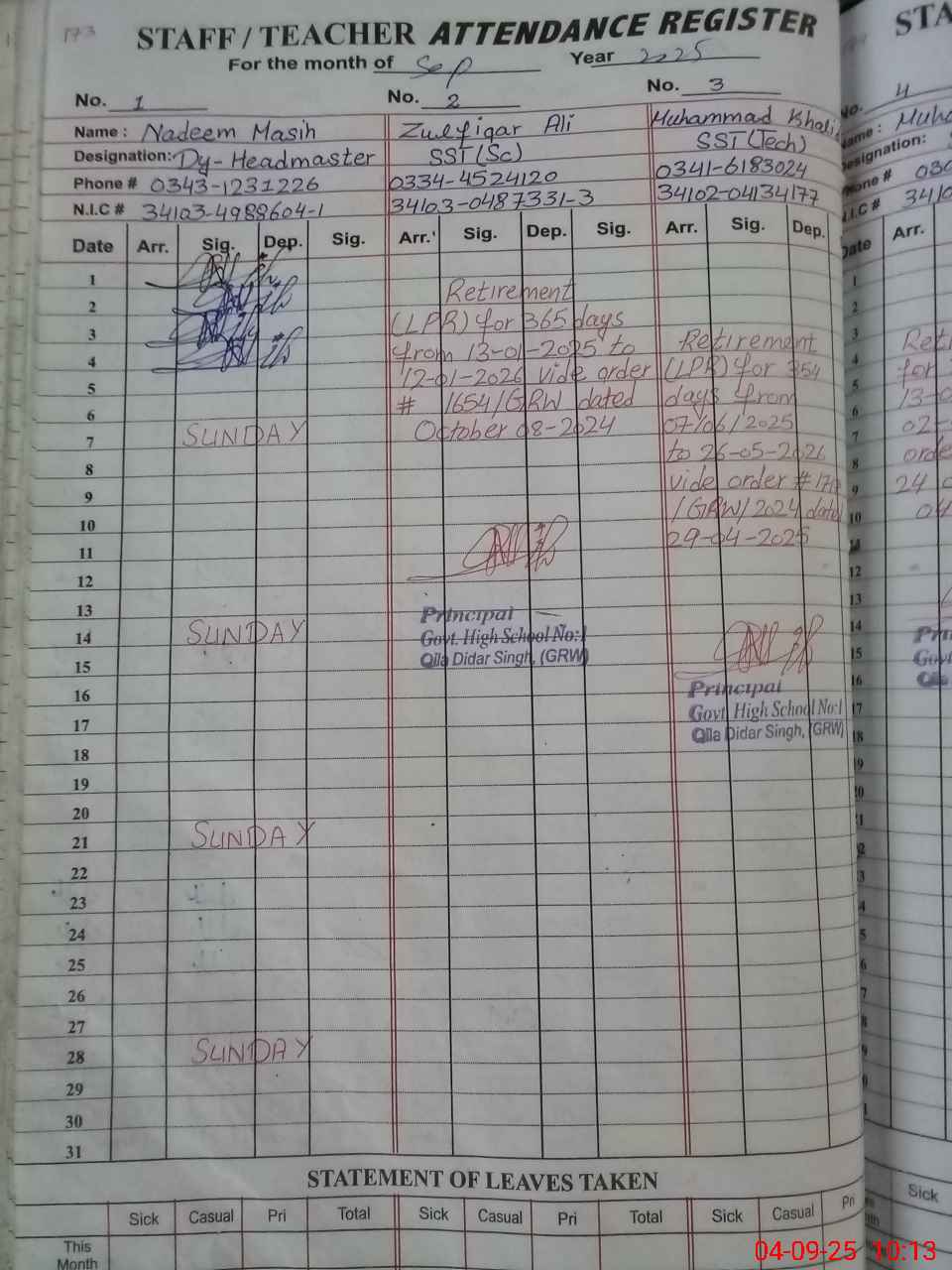 | CNIC | Full Name | Designation | R/C | Absence During Last Calender Month |