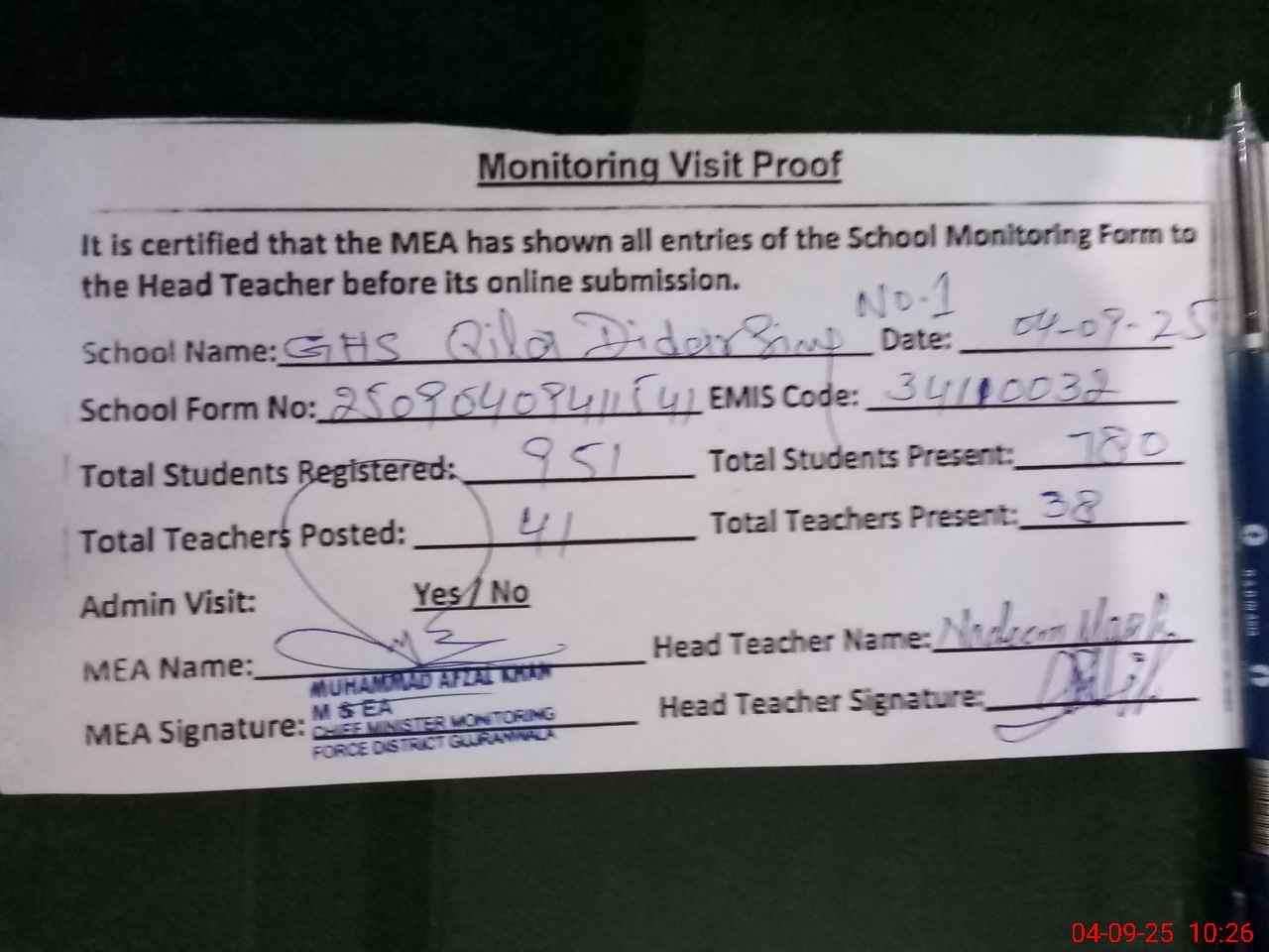 | Attendance Register | Head Teacher | MEA with School | Visit Proof |