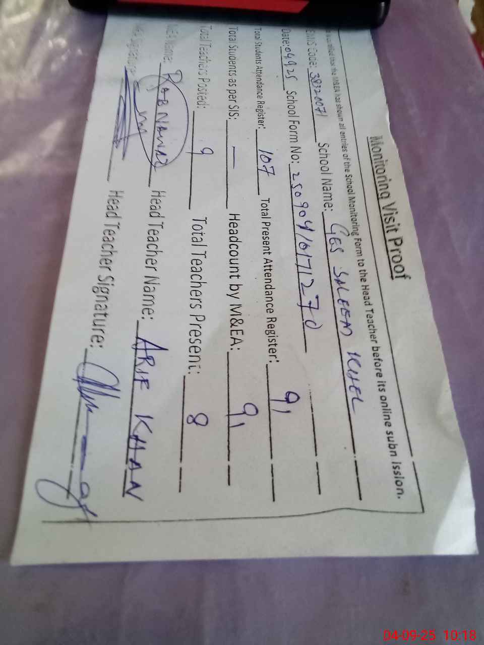 | Attendance Register | Head Teacher | MEA with School | Visit Proof |