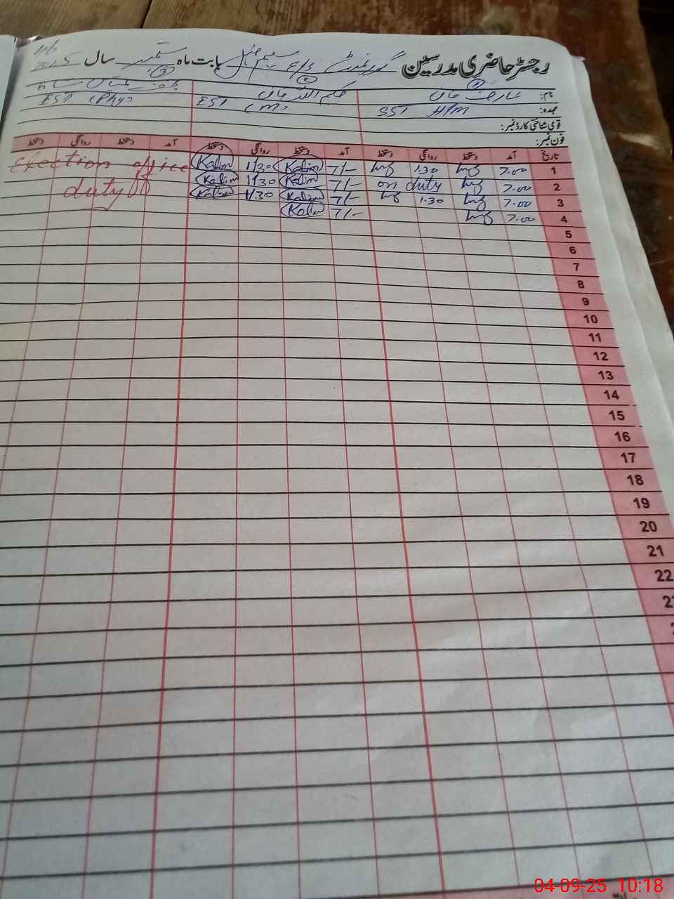 | CNIC | Full Name | Designation | R/C | Absence During Last Calender Month |