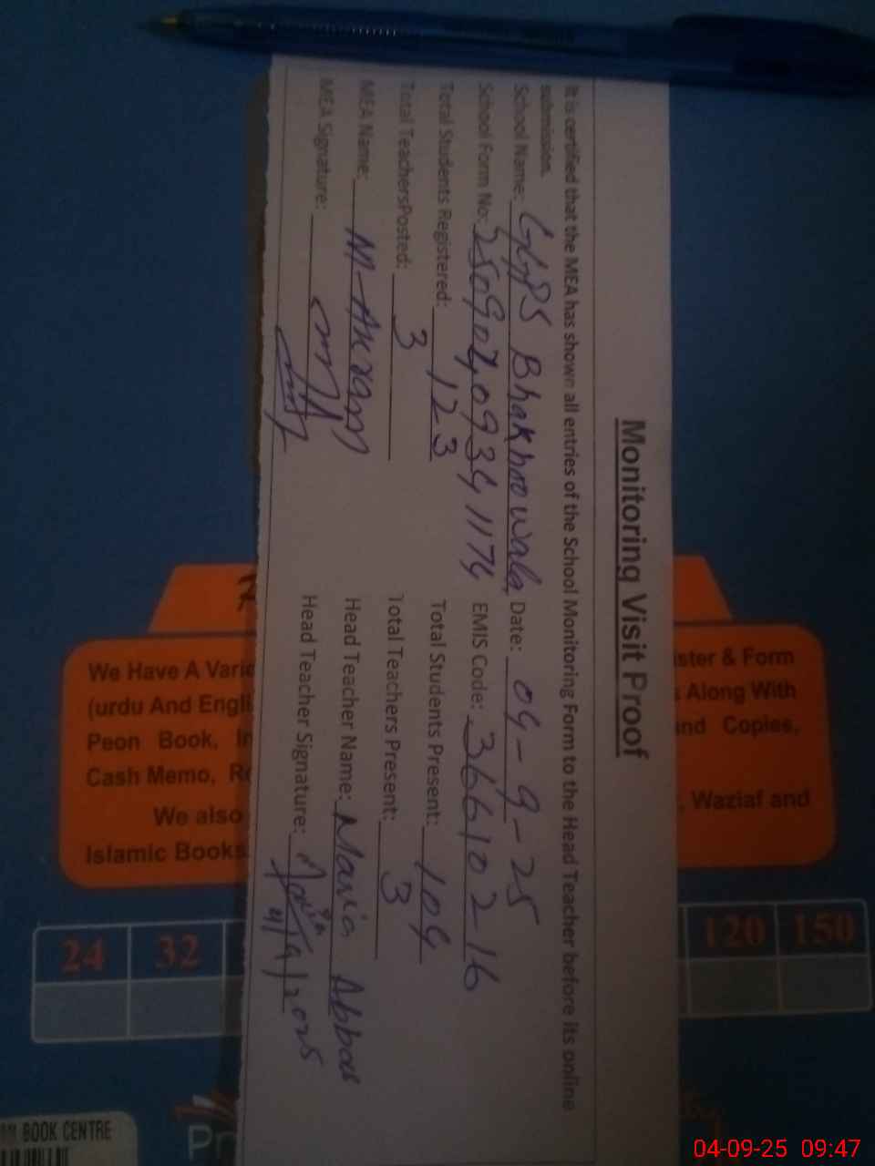 | Attendance Register | Head Teacher | MEA with School | Visit Proof |