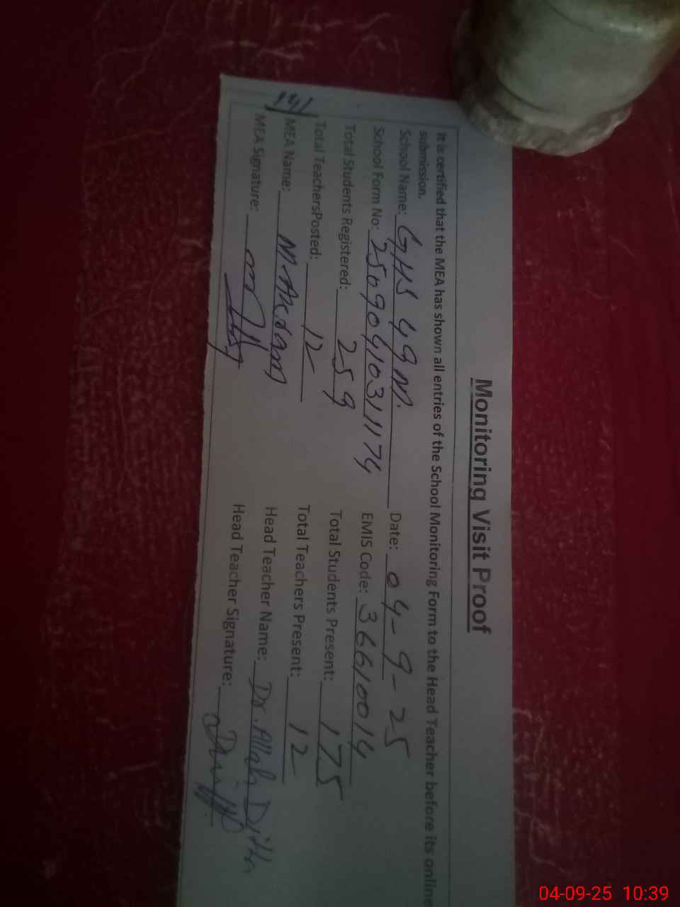 | Attendance Register | Head Teacher | MEA with School | Visit Proof |