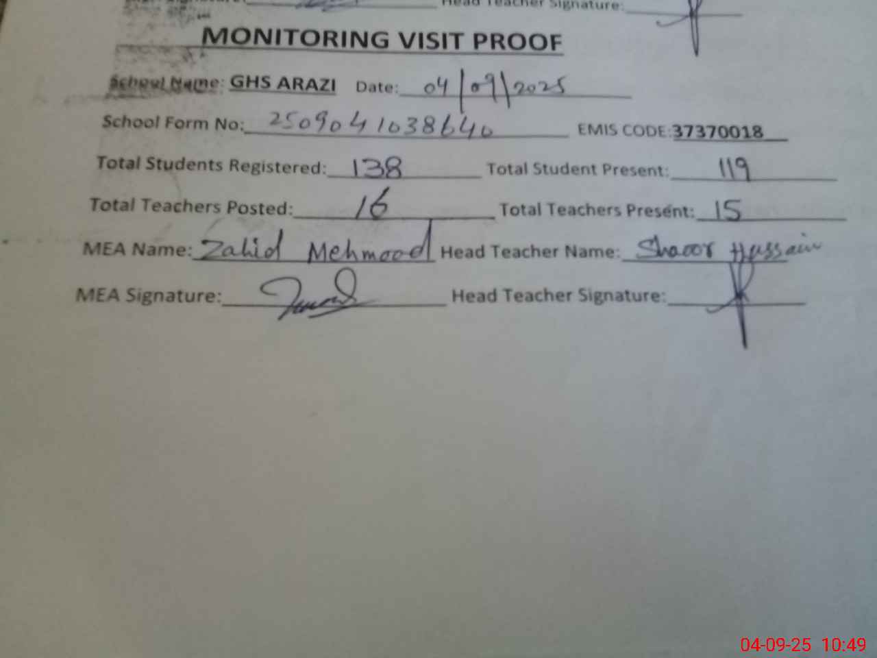 | Attendance Register | Head Teacher | MEA with School | Visit Proof |