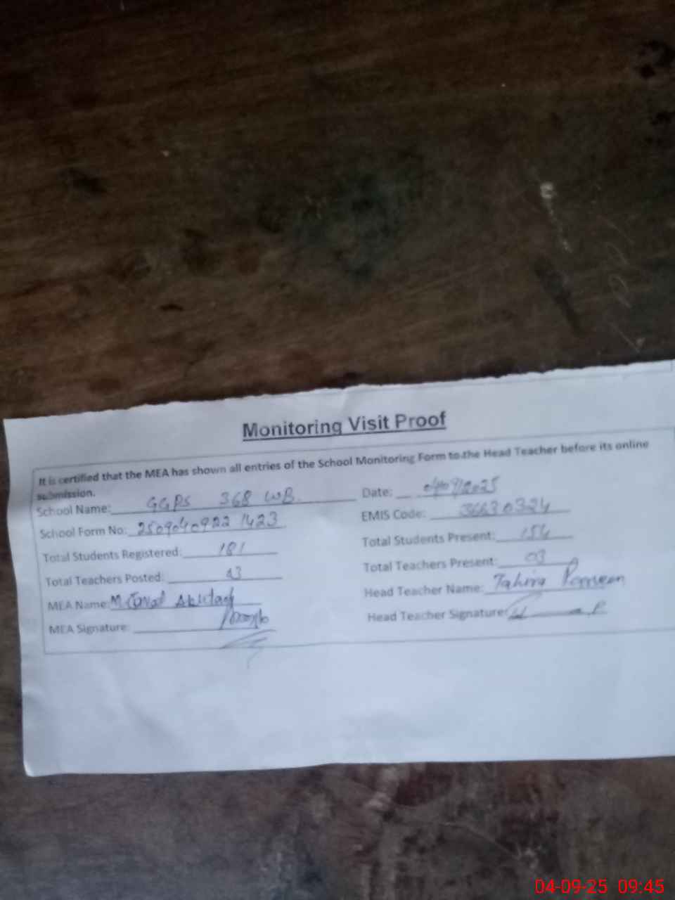 | Attendance Register | Head Teacher | MEA with School | Visit Proof |