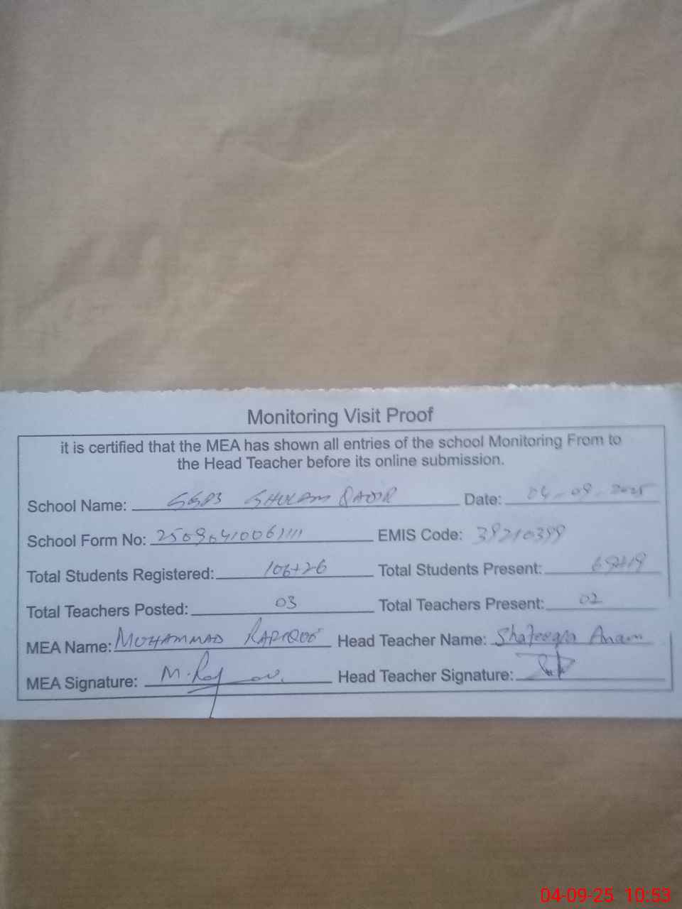 | Attendance Register | Head Teacher | MEA with School | Visit Proof |