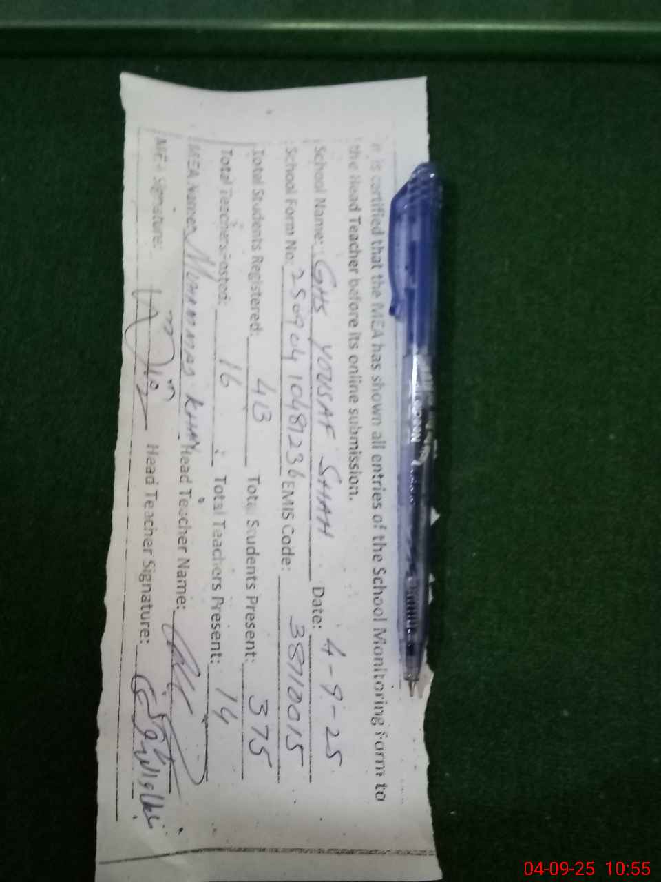 | Certified that this School was Inspected by the Undersigned MEA/DMO Today and the Information Stated Above is as Per Record. | |||||