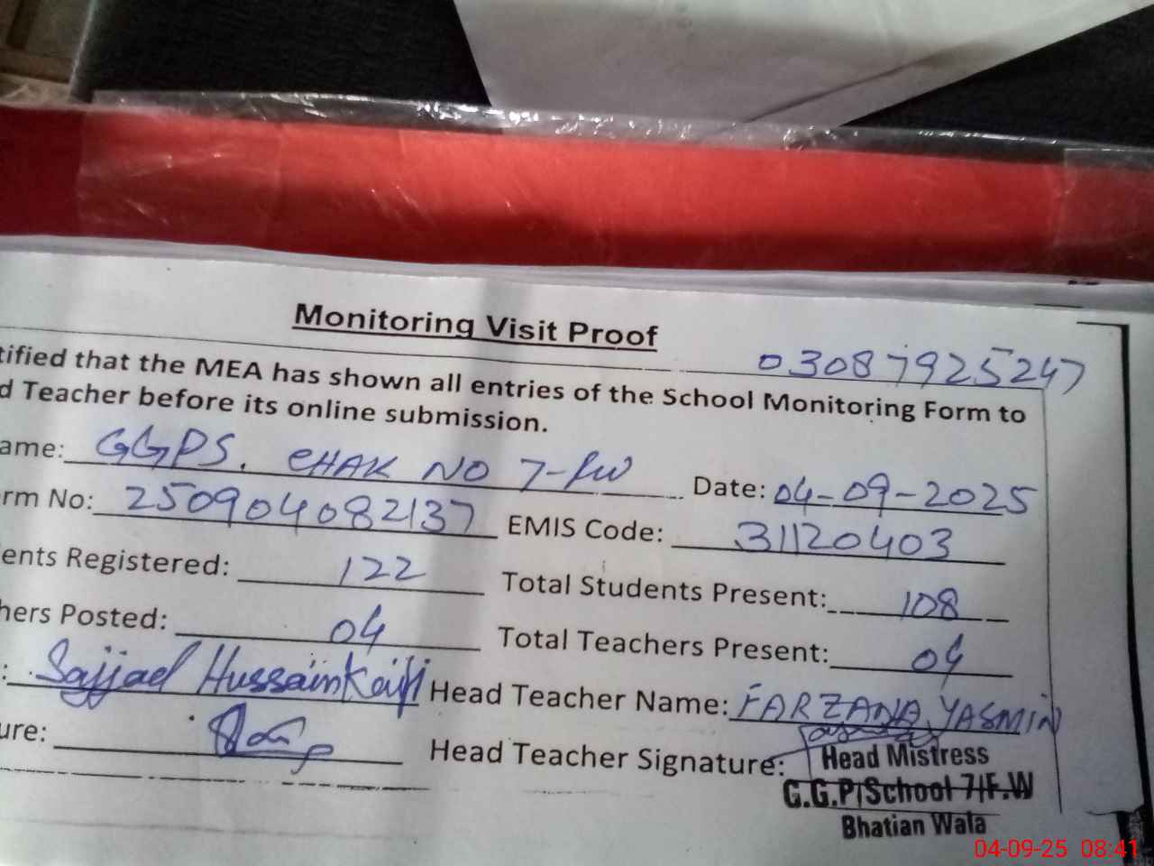 | Attendance Register | Head Teacher | MEA with School | Visit Proof |