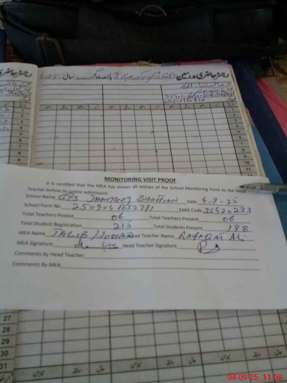| Attendance Register | Head Teacher | MEA with School | Visit Proof |