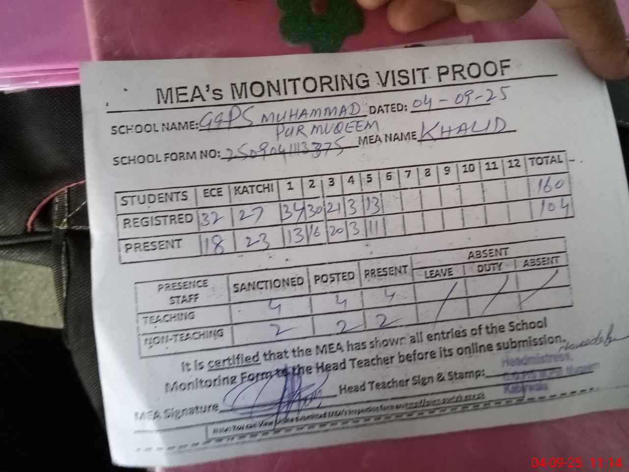 | Attendance Register | Head Teacher | MEA with School | Visit Proof |