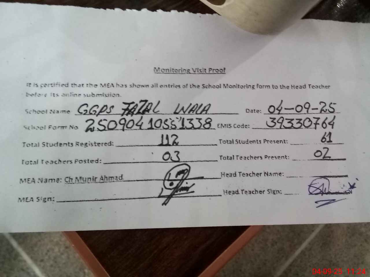 | EMIS Code: 39330764 | Name of School: GGPS CHAK FAZAL WALA | |||