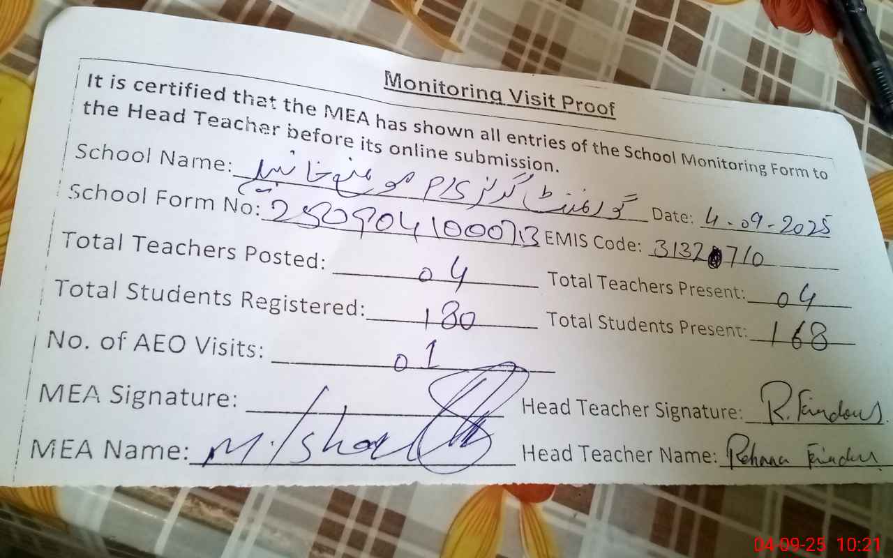 | Attendance Register | Head Teacher | MEA with School | Visit Proof |