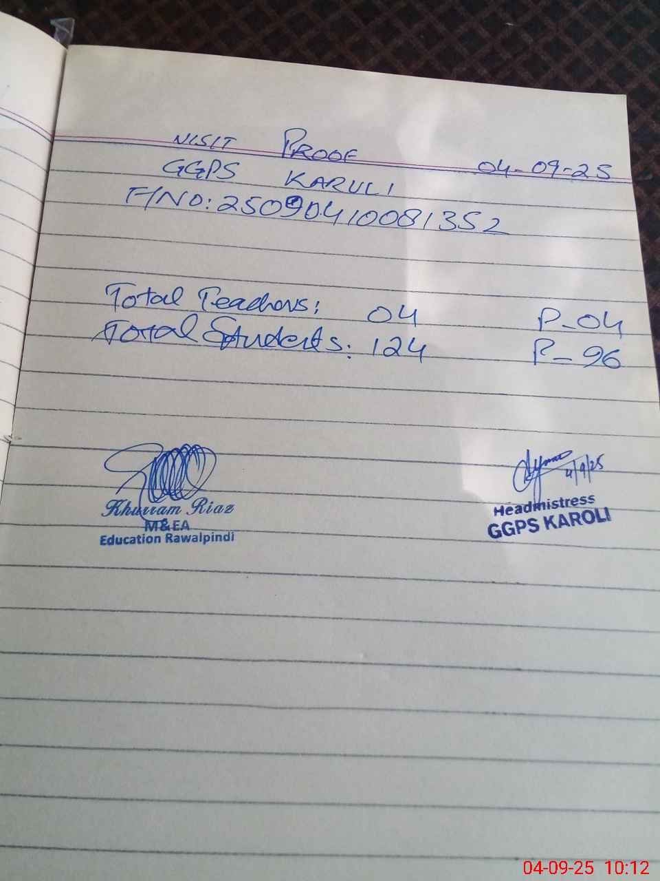 | Attendance Register | Head Teacher | MEA with School | Visit Proof |