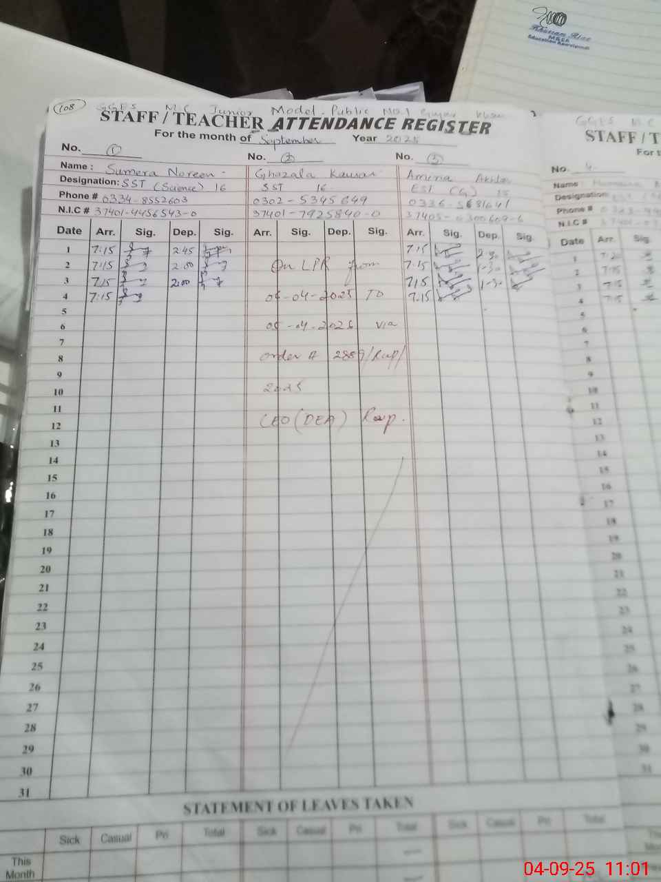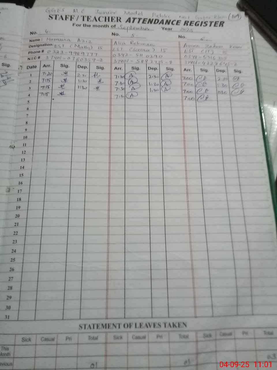 | CNIC | Full Name | Designation | R/C | Absence During Last Calender Month |