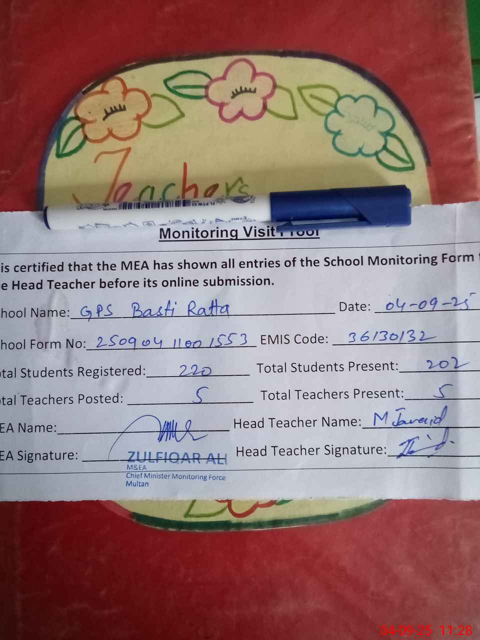 | Attendance Register | Head Teacher | MEA with School | Visit Proof |
