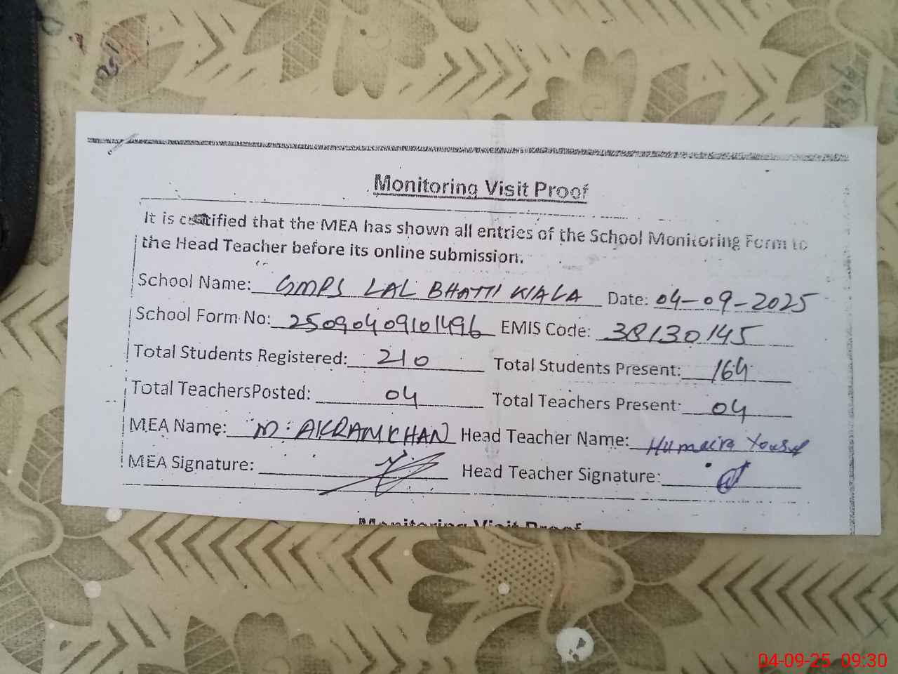 | Attendance Register | Head Teacher | MEA with School | Visit Proof |
