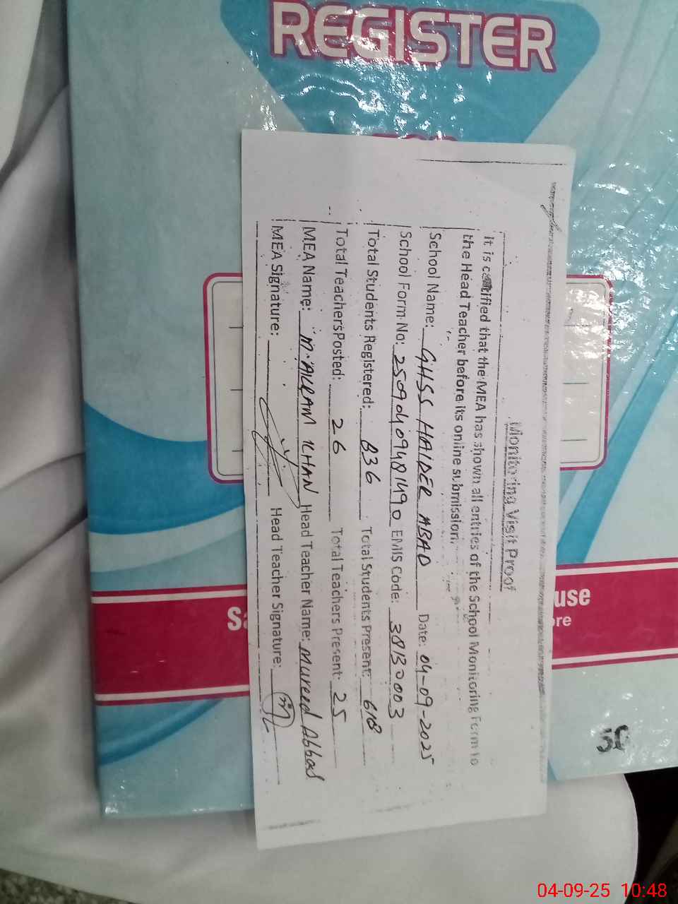 | Attendance Register | Head Teacher | MEA with School | Visit Proof |