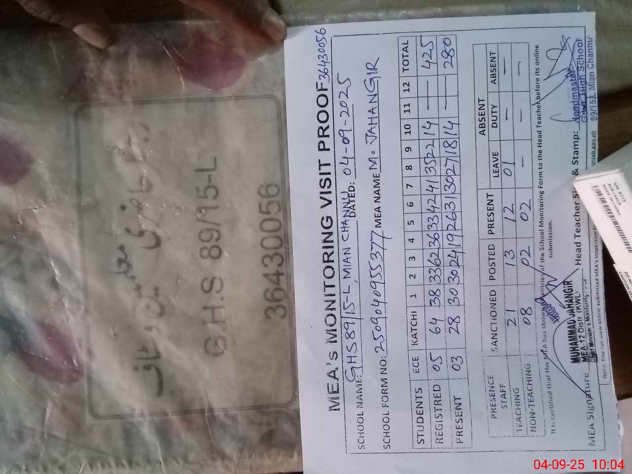 | EMIS Code: 36430056 | Name of School: GHS 89/15-L P/O 64/15-L, MIAN CHANNU | |||