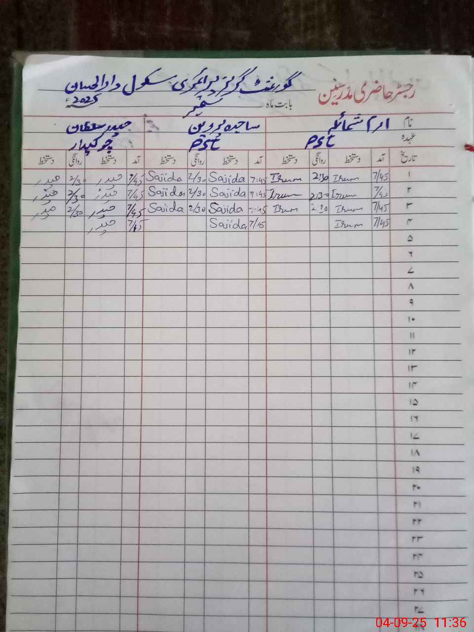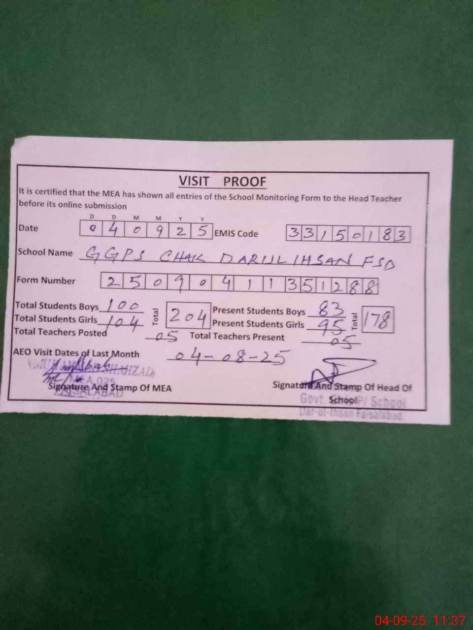 | Attendance Register | Head Teacher | MEA with School | Visit Proof |