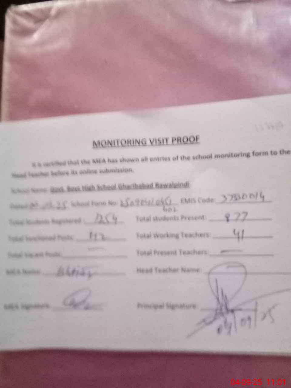 | Attendance Register | Head Teacher | MEA with School | Visit Proof |