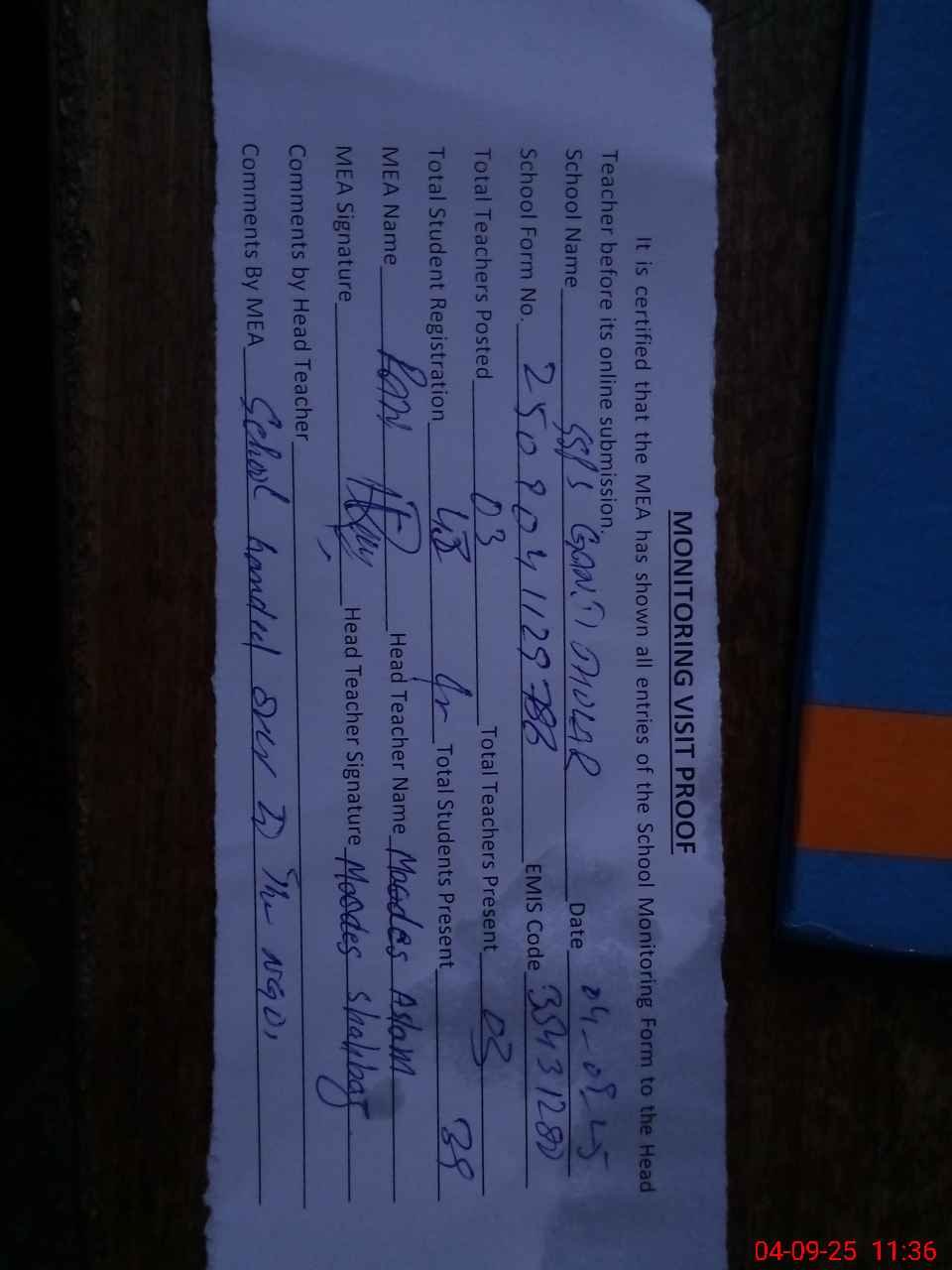 | Attendance Register | Head Teacher | MEA with School | Visit Proof |