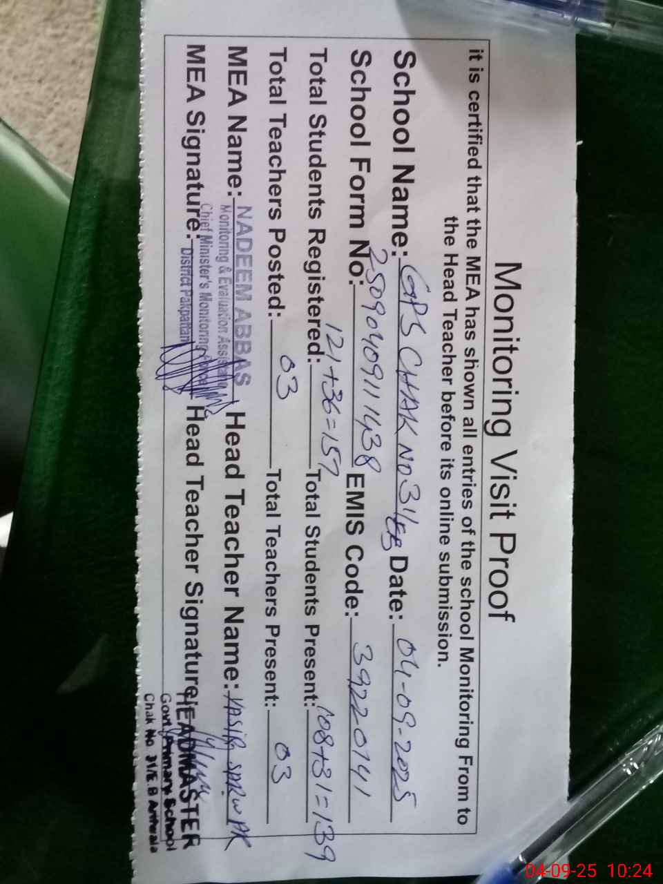 | Attendance Register | Head Teacher | MEA with School | Visit Proof |