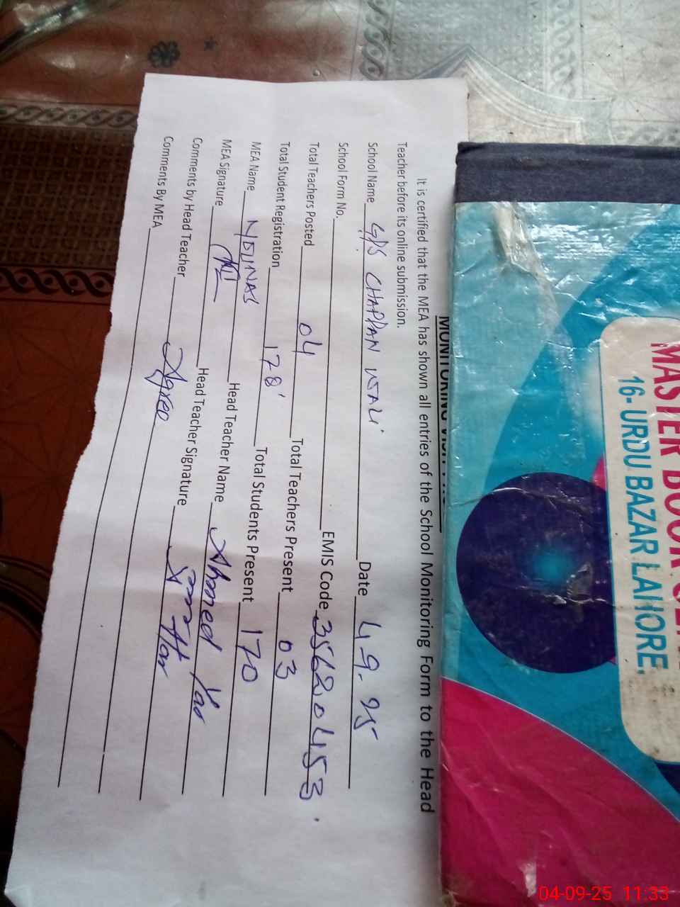 | EMIS Code: 35620453 | Name of School: GPS CHHAPAN WALI | |||