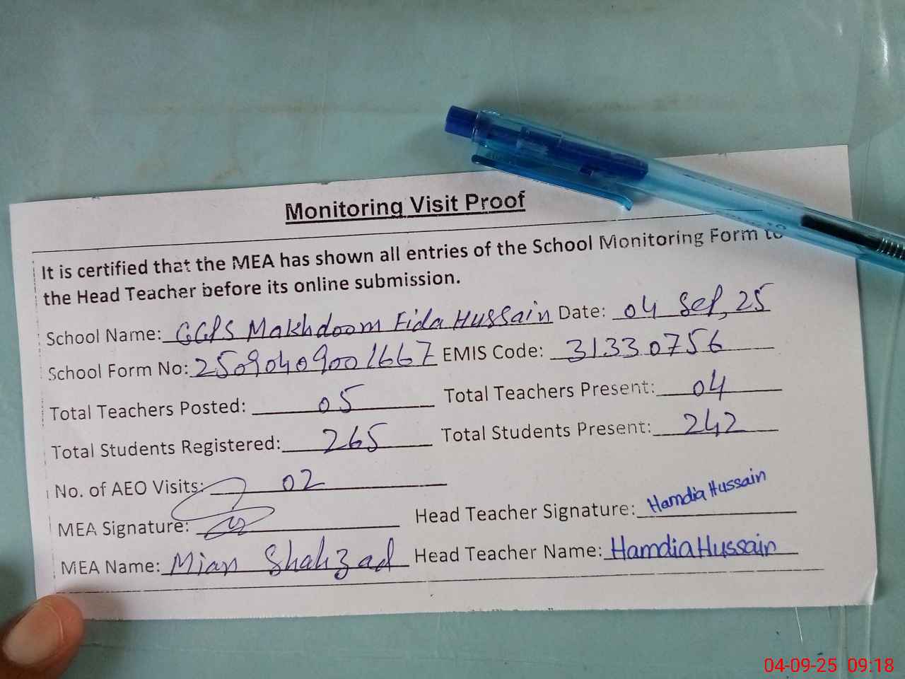 | EMIS Code: 31330756 | Name of School: GGPS MAKHDOOM FIDA HUSSAIN | |||