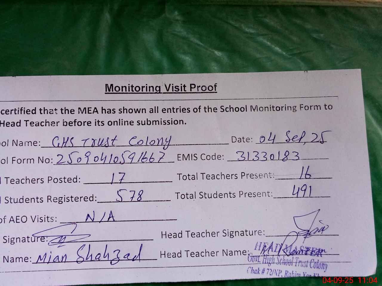 | Attendance Register | Head Teacher | MEA with School | Visit Proof |