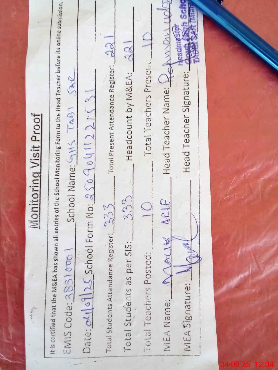 | Attendance Register | Head Teacher | MEA with School | Visit Proof |