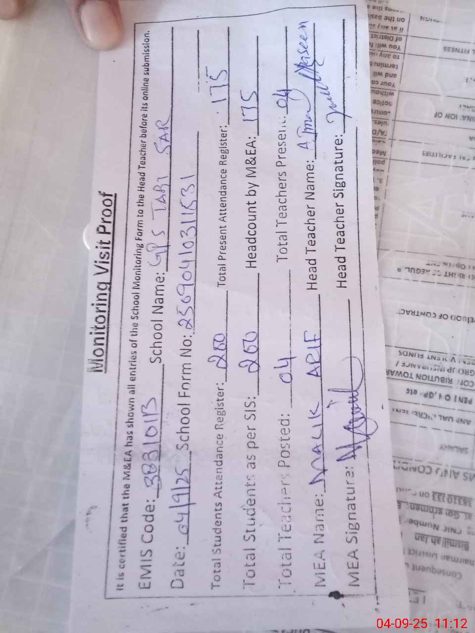 | Attendance Register | Head Teacher | MEA with School | Visit Proof |