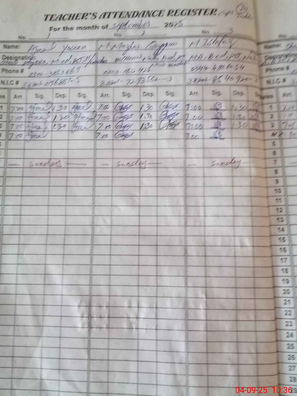 | CNIC | Full Name | Designation | R/C | Absence During Last Calender Month |