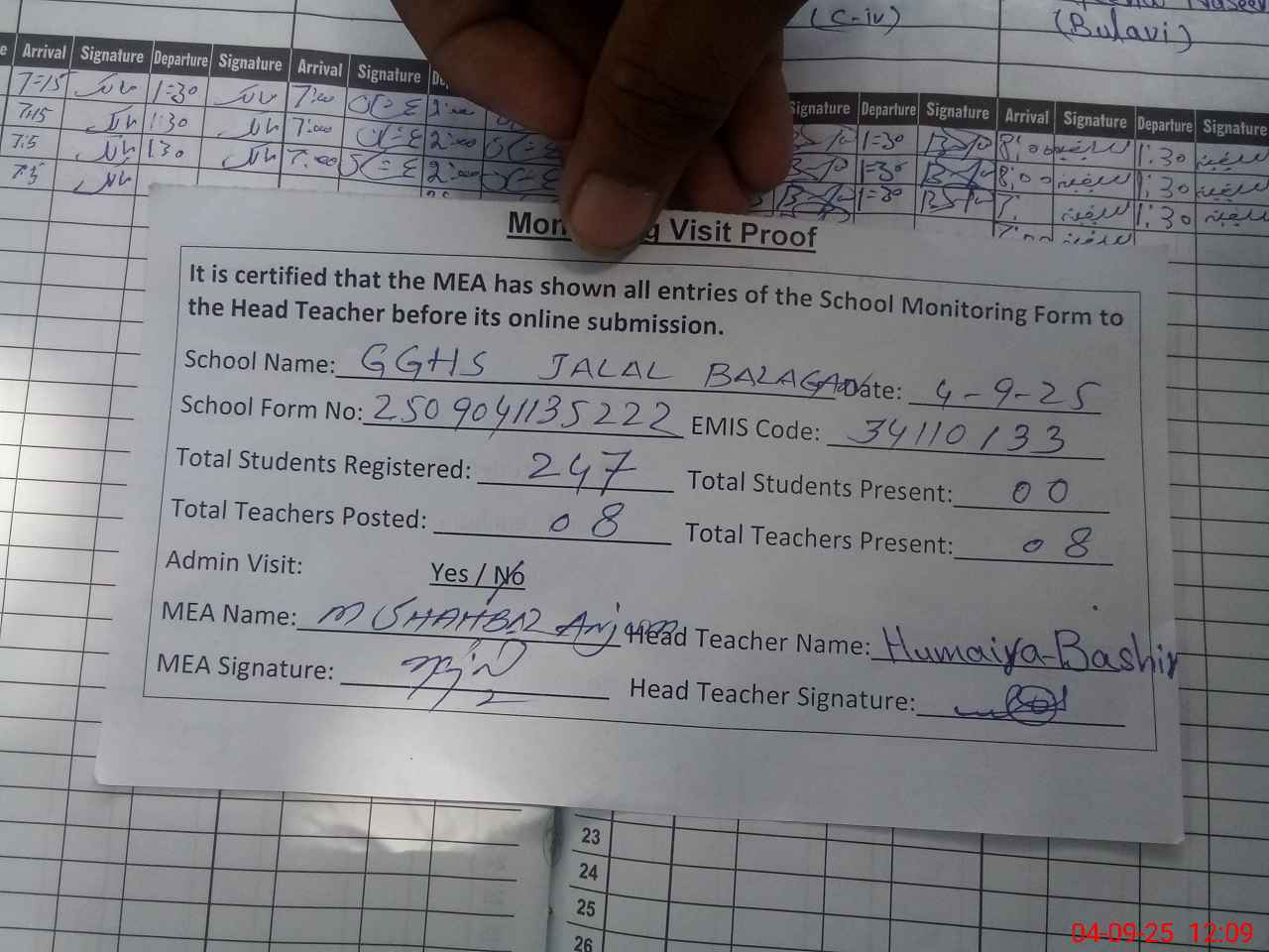 | EMIS Code: 34110133 | Name of School: GGHS JALAL BALAGAN | |||