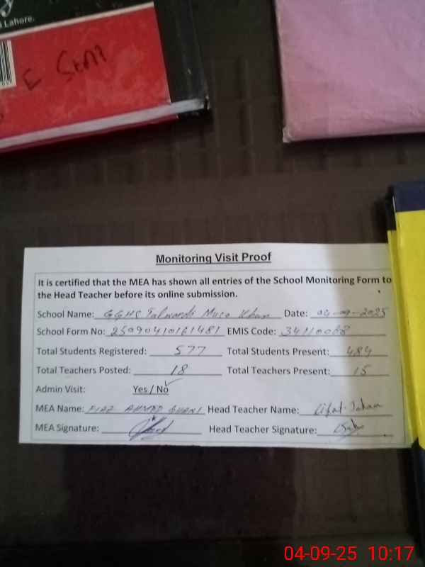 | EMIS Code: 34110068 | Name of School: GGHS TALWANDI MUSA KHAN | |||
