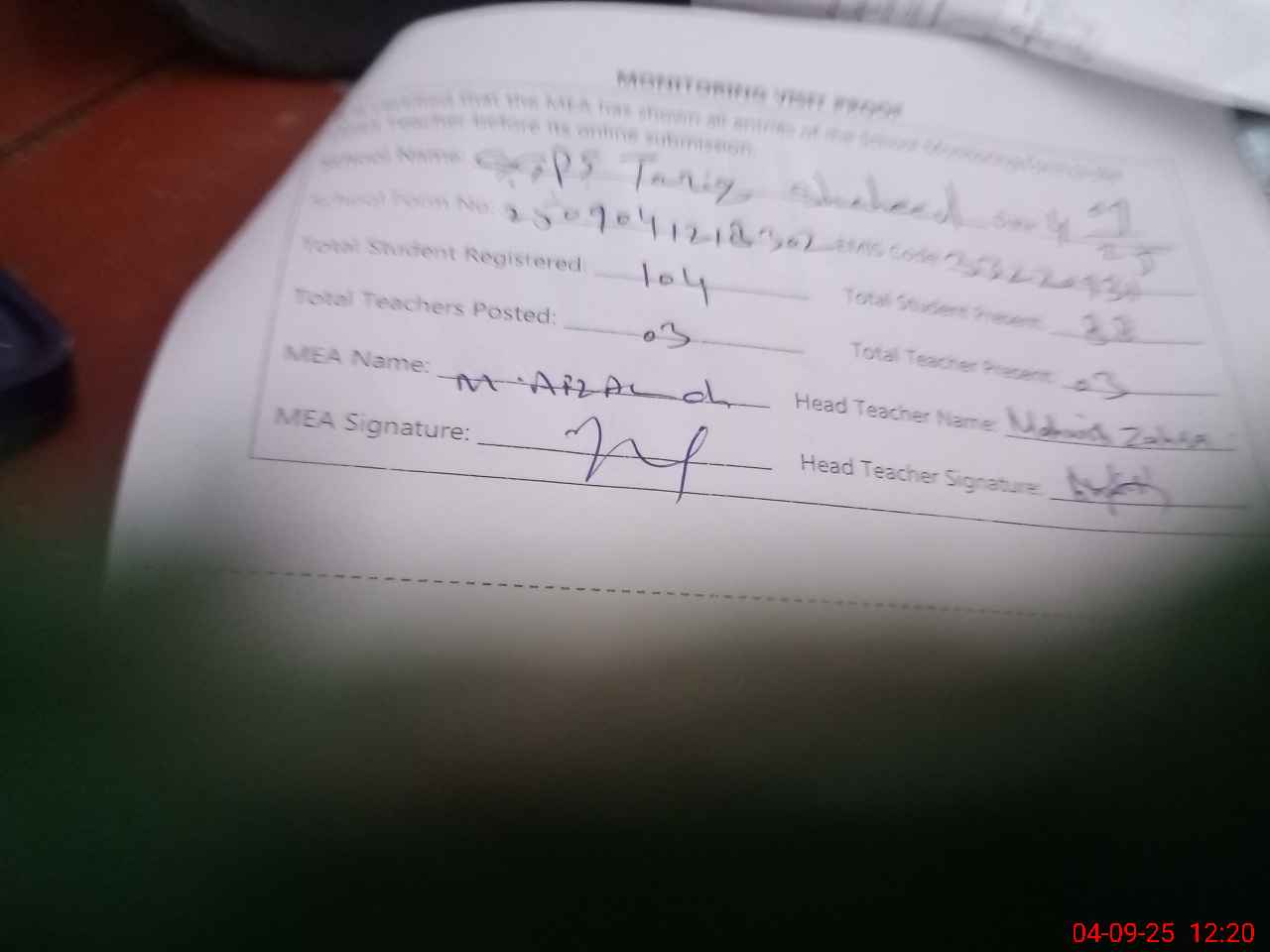 | Attendance Register | Head Teacher | MEA with School | Visit Proof |