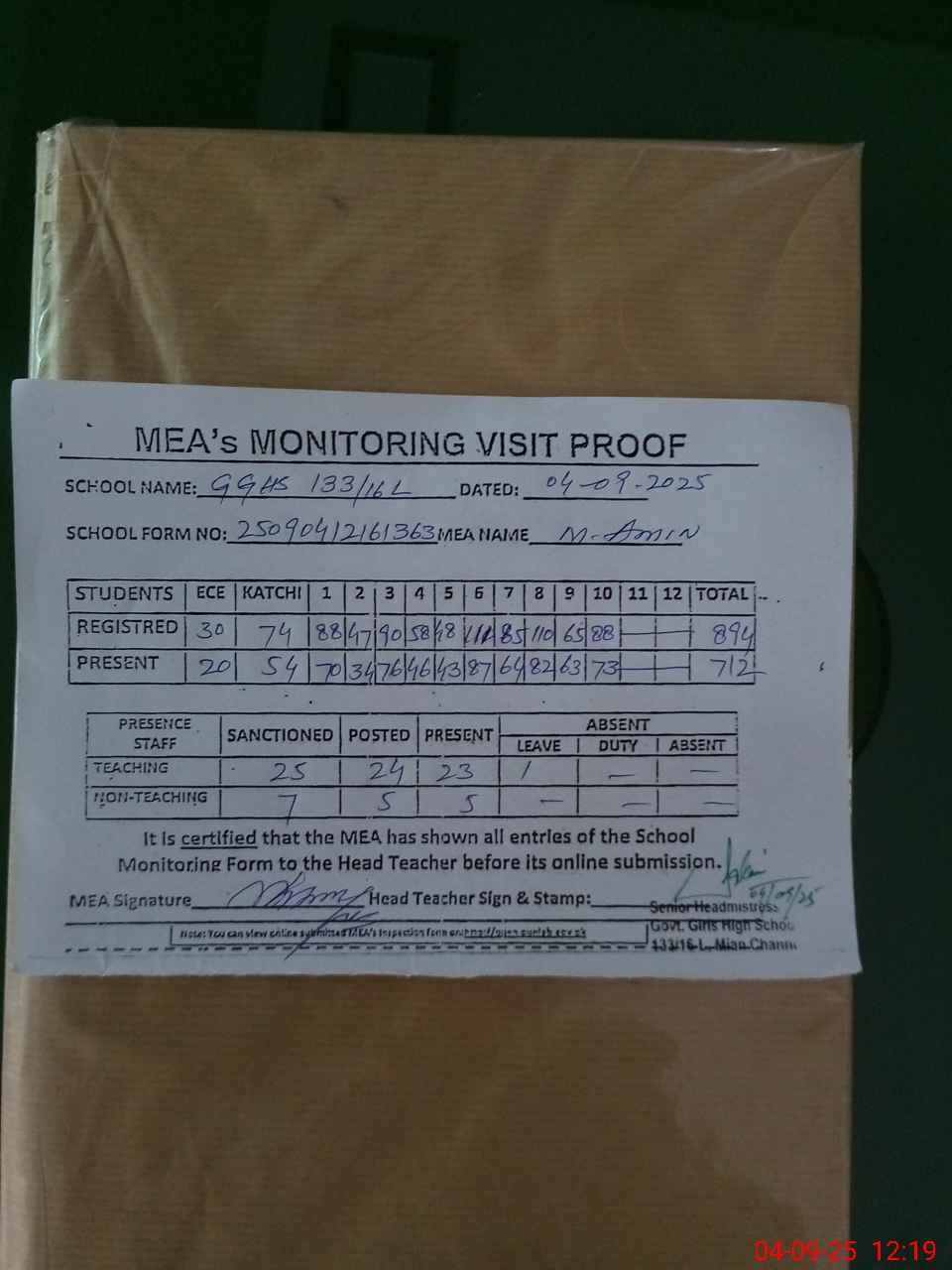| Attendance Register | Head Teacher | MEA with School | Visit Proof |