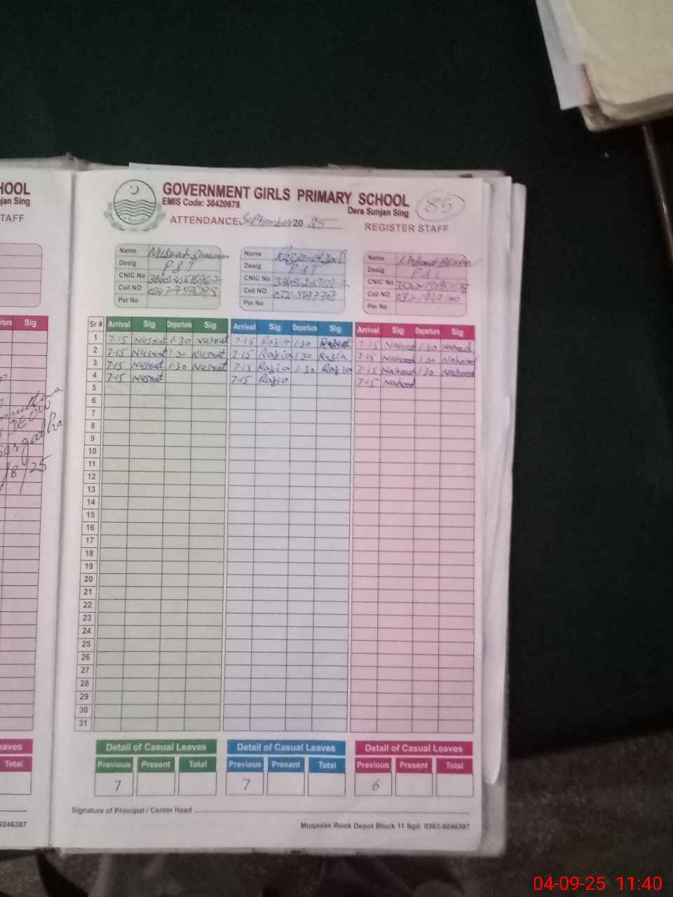 | CNIC | Full Name | Designation | R/C | Absence during last cal. month |