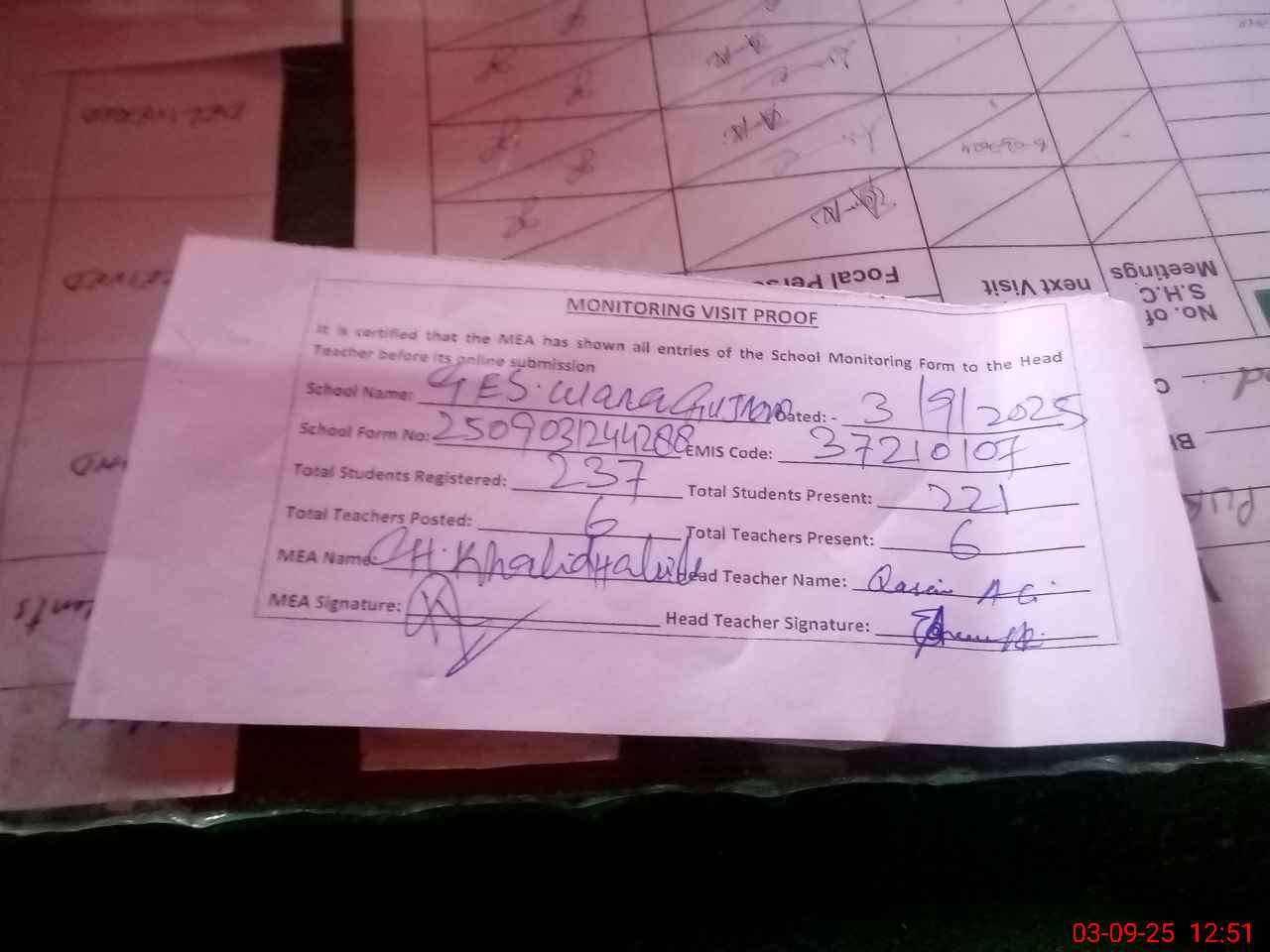 | Attendance Register | Head Teacher | MEA with School | Visit Proof |
