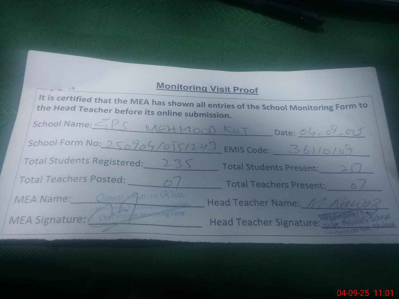 | EMIS Code: 36110109 | Name of School: GPS MEHMOOD KOT BOSAN ROAD MULTAN | |||