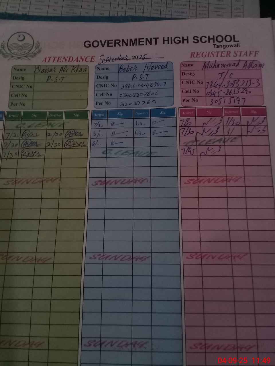 | CNIC | Full Name | Designation | R/C | Absence During Last Calender Month |