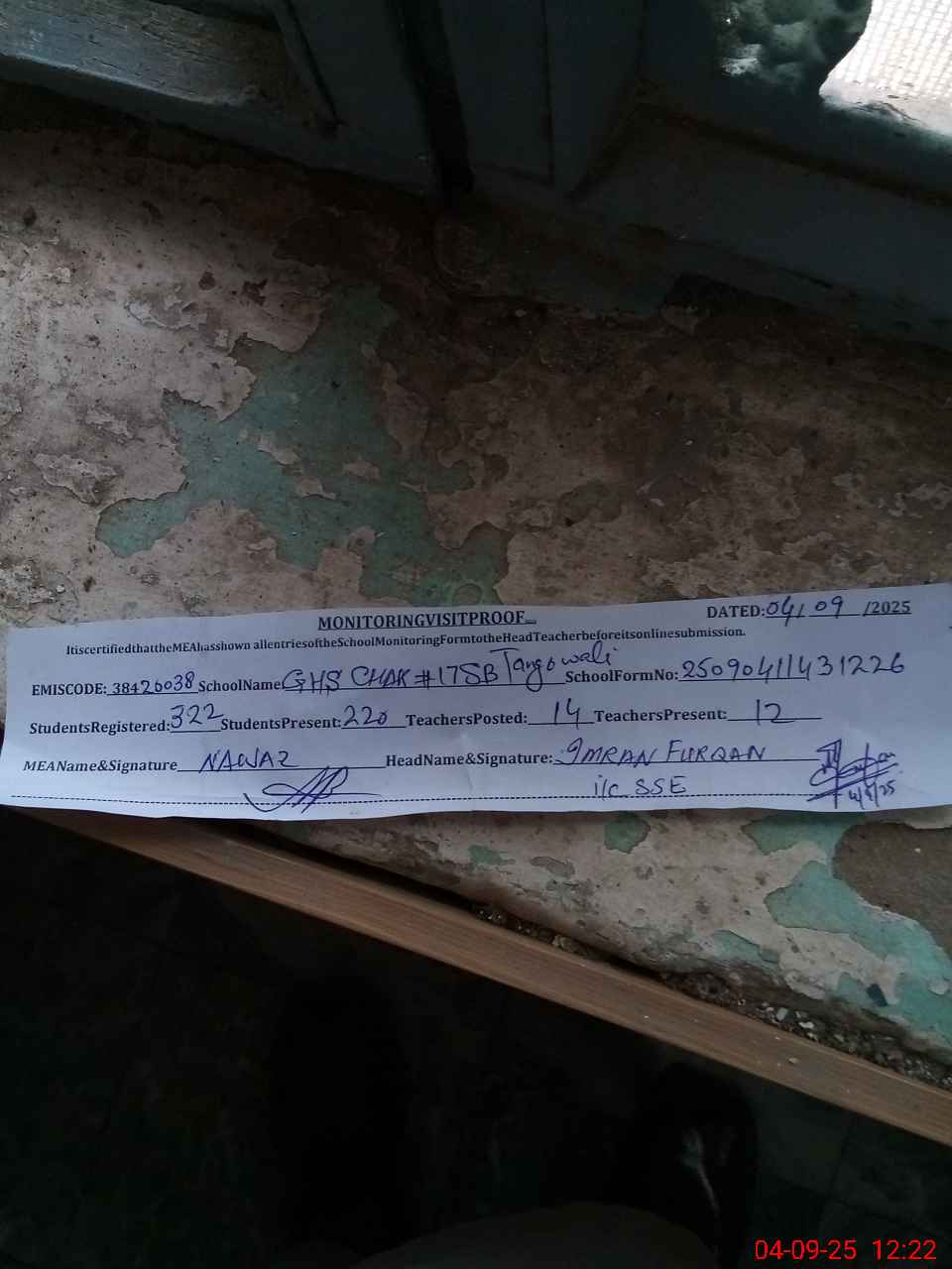 | Attendance Register | Head Teacher | MEA with School | Visit Proof |