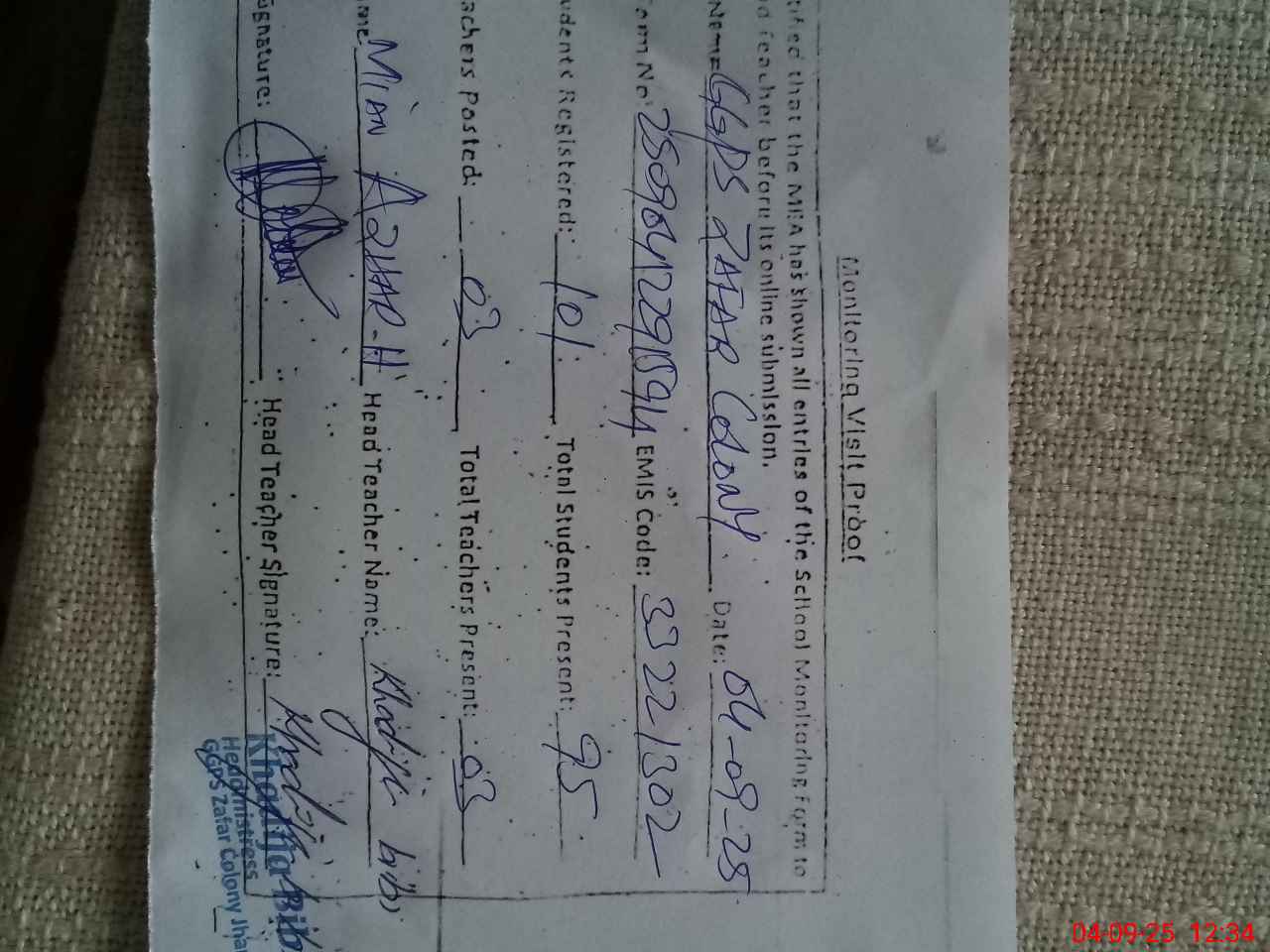 | Name: KH**** BB Designation: (School Headmaster's/Headmistress's) PST Phone/Cell Number: 03**** |