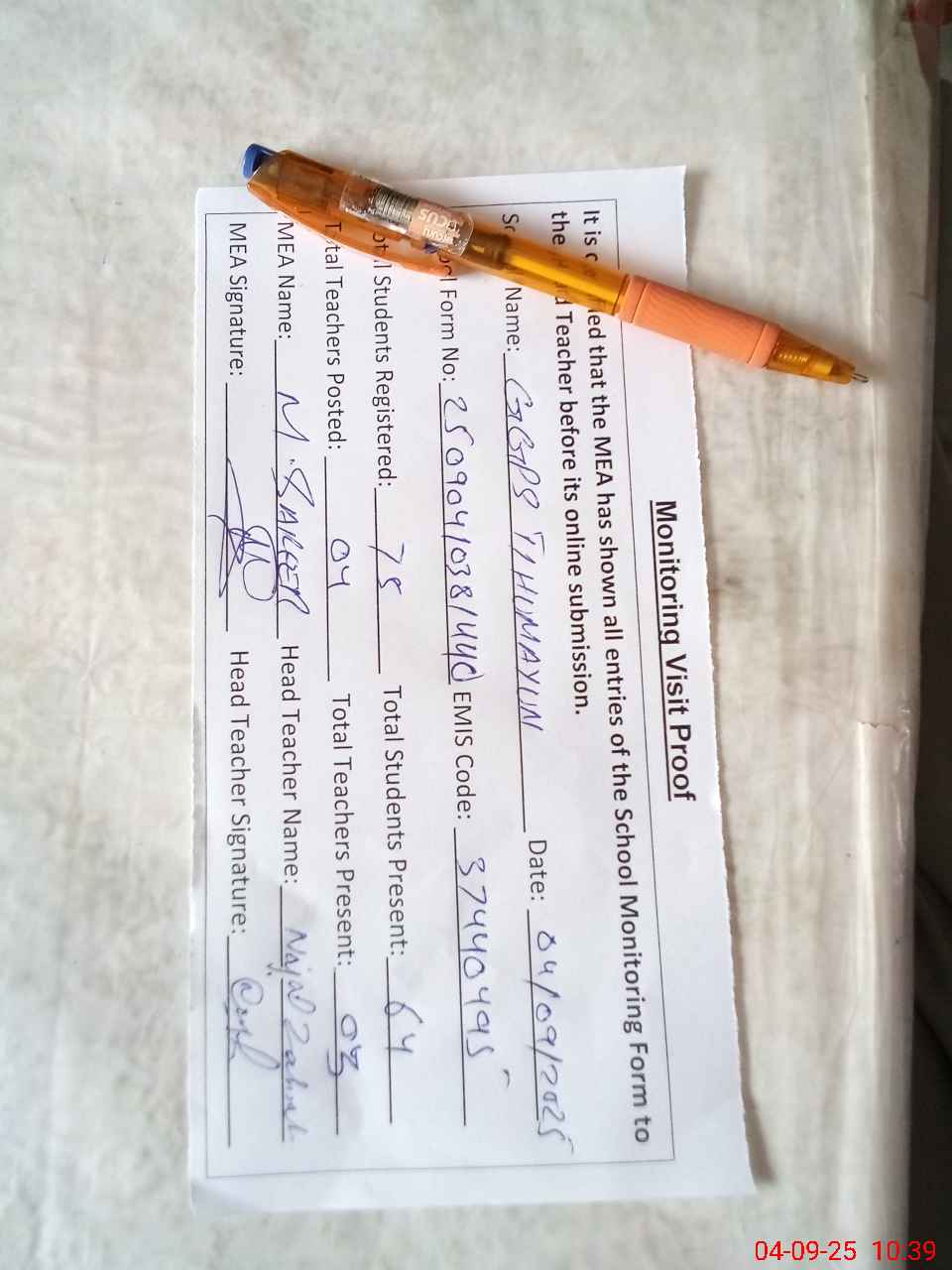 | Attendance Register | Head Teacher | MEA with School | Visit Proof |